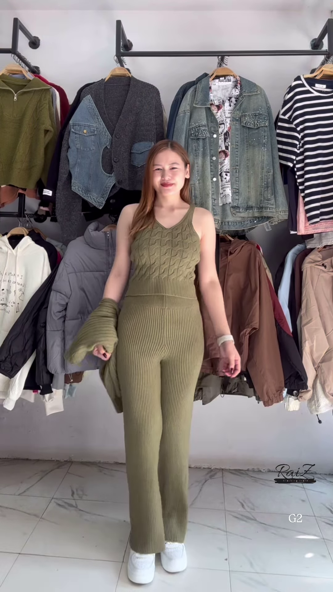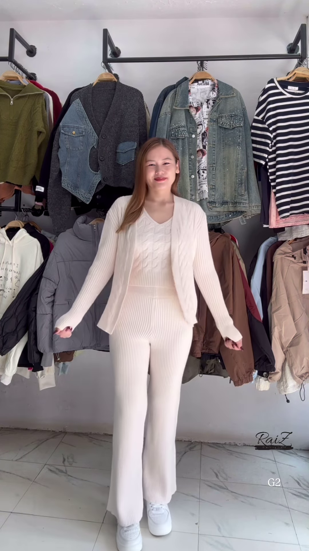 The top piece is a classic open-front cardigan featuring a sophisticated cable knit pattern. The vertical “rope” stitches not only add a beautiful texture to the garment but also create a visually slimming effect. The cardigan is designed with a relaxed, slightly oversized fit, making it perfect for layering over a basic tee or a camisole. The V-neckline is clean and modern, and the ribbed cuffs ensure a snug fit around the wrists. The craftsmanship involved in the knitting ensures that the patterns are consistent and the seams are durable, resisting pilling even after regular wear.