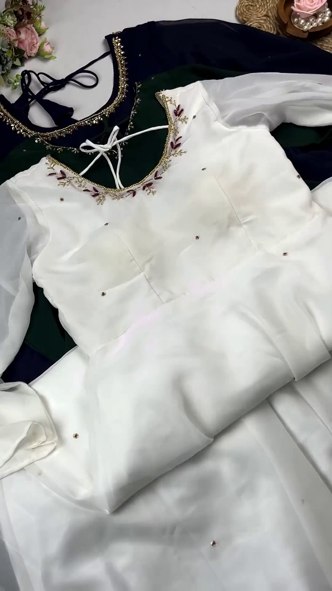 Feature Details Type Premium Designer Embroidered Anarkali Color Forest Green with Gold-Toned Accents Work Type Minimalist Zari Embroidery • Tiny Sequin/Bead Highlights Neckline Sophisticated Curved Neck with Zari Framing Sleeves Full-Length with Scalloped Embroidered Cuffs Back Style Adjustable Dori Tie-Ups for a Secure Fit Fabric High-Quality Georgette or Crepe-Finish Fabric