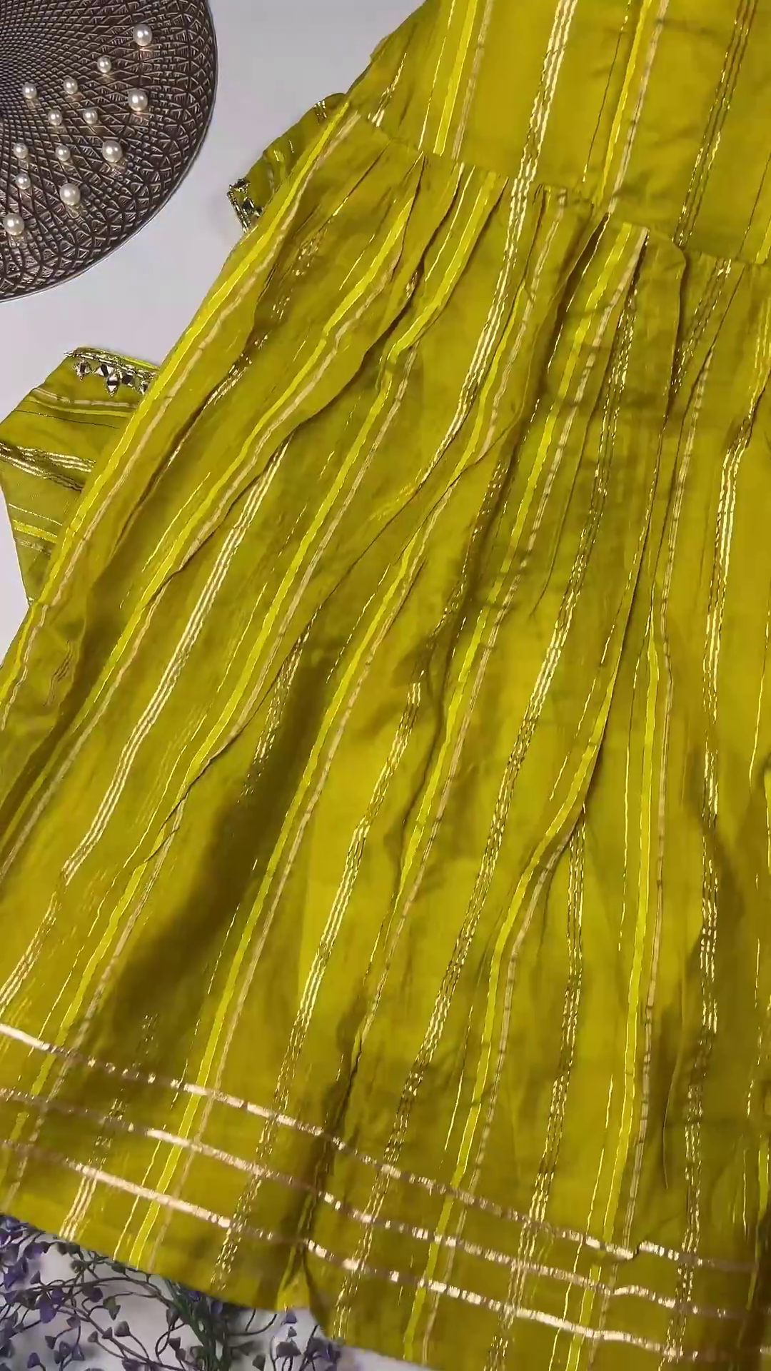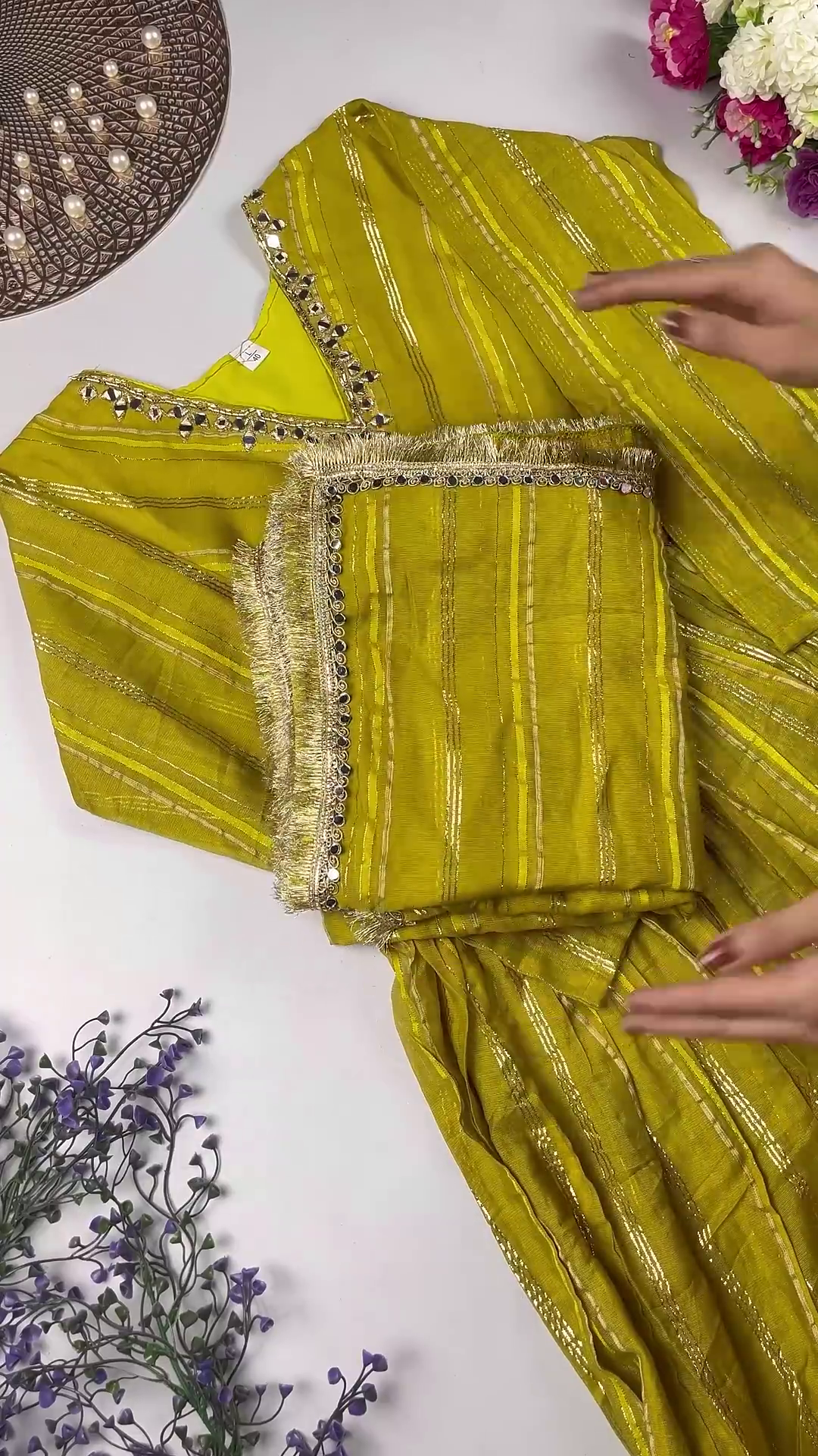 • Pair with traditional gold or kundan jewelry to complement the rich mirror-work and golden lurex stripes.