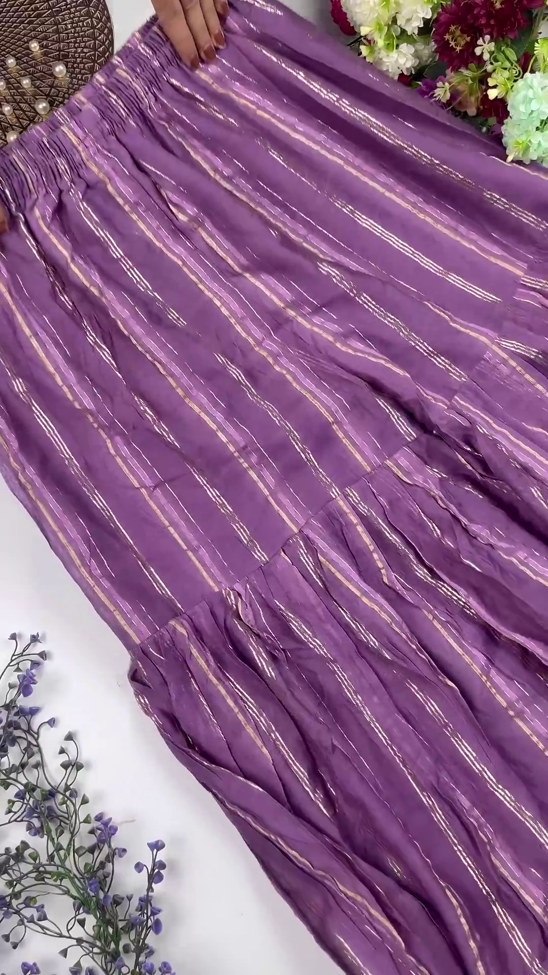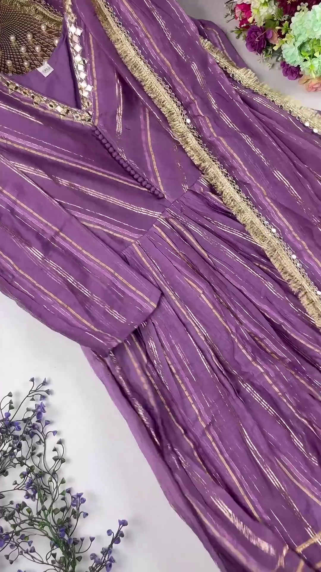 This gown set is an ideal choice for Sangeet nights, Wedding Receptions, and grand festive galas. The light-reflecting lurex stripes and mirror-work make this outfit exceptionally striking for evening events under professional lighting.