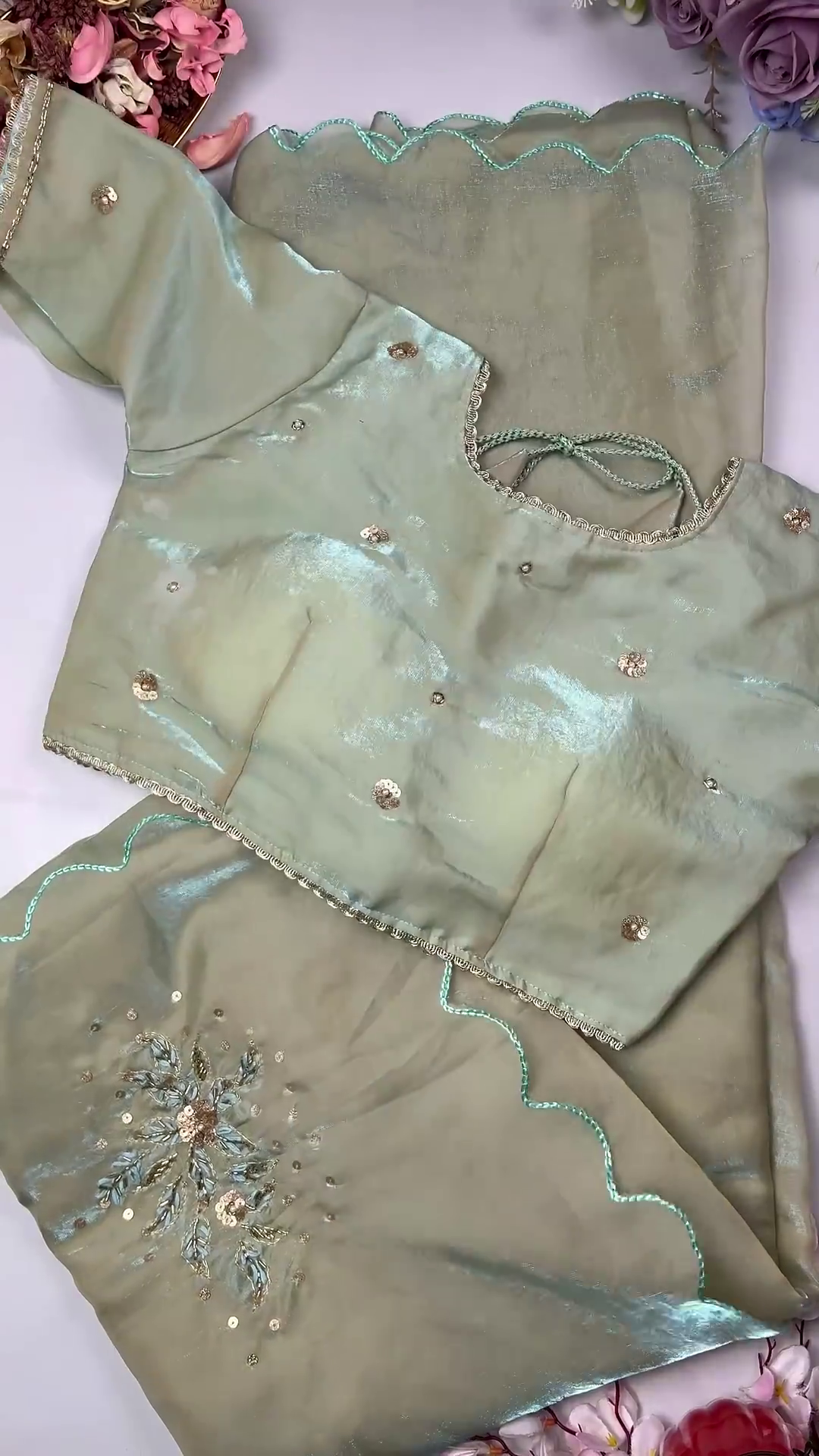Exude ethereal charm in this sophisticated saree set, masterfully crafted from premium shimmer silk fabric that offers a luxurious metallic glow and a structured, graceful drape. The ensemble features a coordinating shimmer silk blouse with a classic round neckline, elegantly finished with a delicate golden scalloped zari border along the hem and sleeves. The bodice is accented with scattered golden sequin “buttis” and a functional dori tie-up at the back with matching fabric tassels.