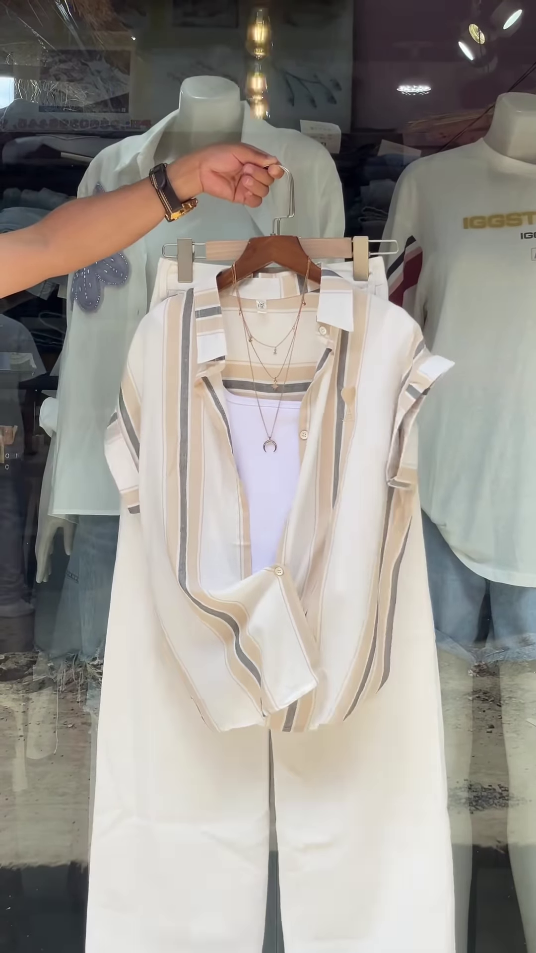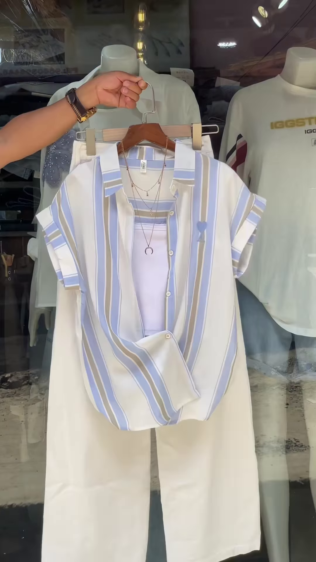 Add a playful twist to your everyday wardrobe with this pink and white striped shirt layered over a classic white tank top. Designed for women who love relaxed silhouettes and expressive accessories, this outfit blends casual comfort with boutique-ready charm—perfect for catalog shoots, WhatsApp fashion drops, or storefront styling.