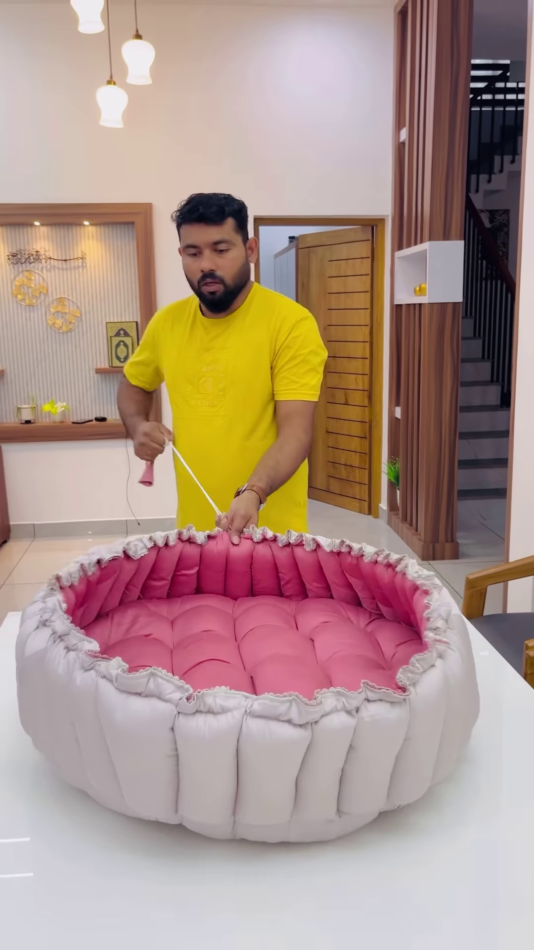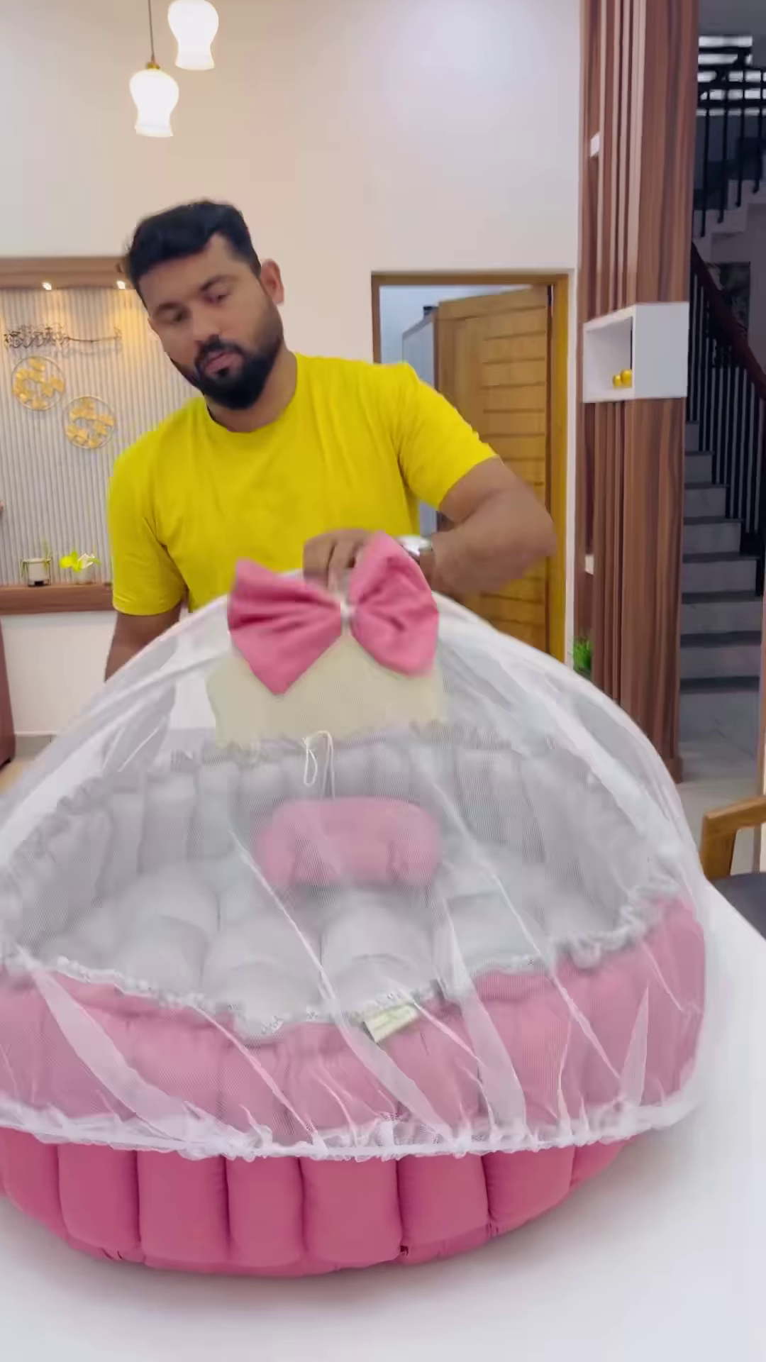 Also included in the set is a circular padded play mat or bedding base, finished with delicate white lace edging. The set comes with matching bolsters and a cushioned pillow featuring an ergonomic “concave” center to support your baby’s head properly. Every piece in this collection is designed with safety and comfort as top priorities, using hypoallergenic fillings that maintain their shape even after regular use and washing. The high-quality stitching ensures that the padding remains evenly distributed, providing consistent support for your little one.