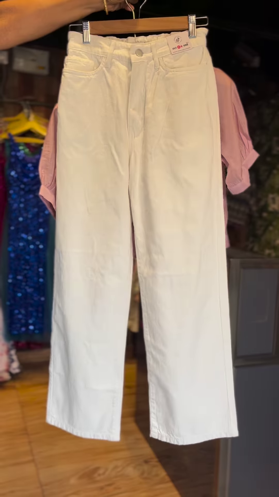 The set is completed with a pair of pristine white straight-leg trousers. These trousers offer a clean, streamlined fit that elongates the appearance of the legs. The contrast between the soft mauve top and the bright white bottom creates a crisp, energetic look that is highly photogenic. The high-waisted design of the trousers ensures a secure and flattering fit, while the breathable fabric keeps you comfortable from morning until evening. This three-piece set is designed to be highly functional, as each piece can also be styled separately with other items in your wardrobe.